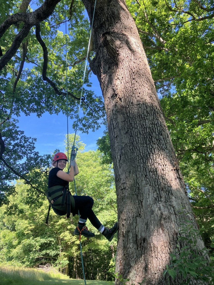 Nina tried rock climbing for the first time and says she learned new knots for tree climbing. She attended camp sessions including Tree Traversal, Trail Blazing, Cadette Crossing, and Ropes and Routes. One of her favorite memories is starting a fire for the Counselors-in-Training (CITs).